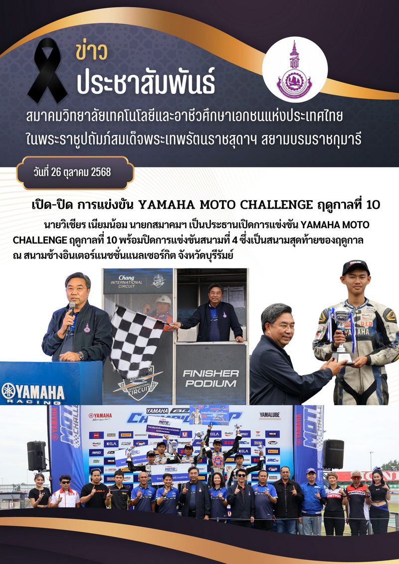 นายวิเชียร เนียมน้อม นายกสมาคมฯ เป็นประธานเปิดการแข่งขัน YAMAHA MOTO CHALLENGE ฤดูกาลที่ 10 วันที่ 26 ตุลาคม 2568 ณ สนามช้าง จ.บุรีรัมย์
