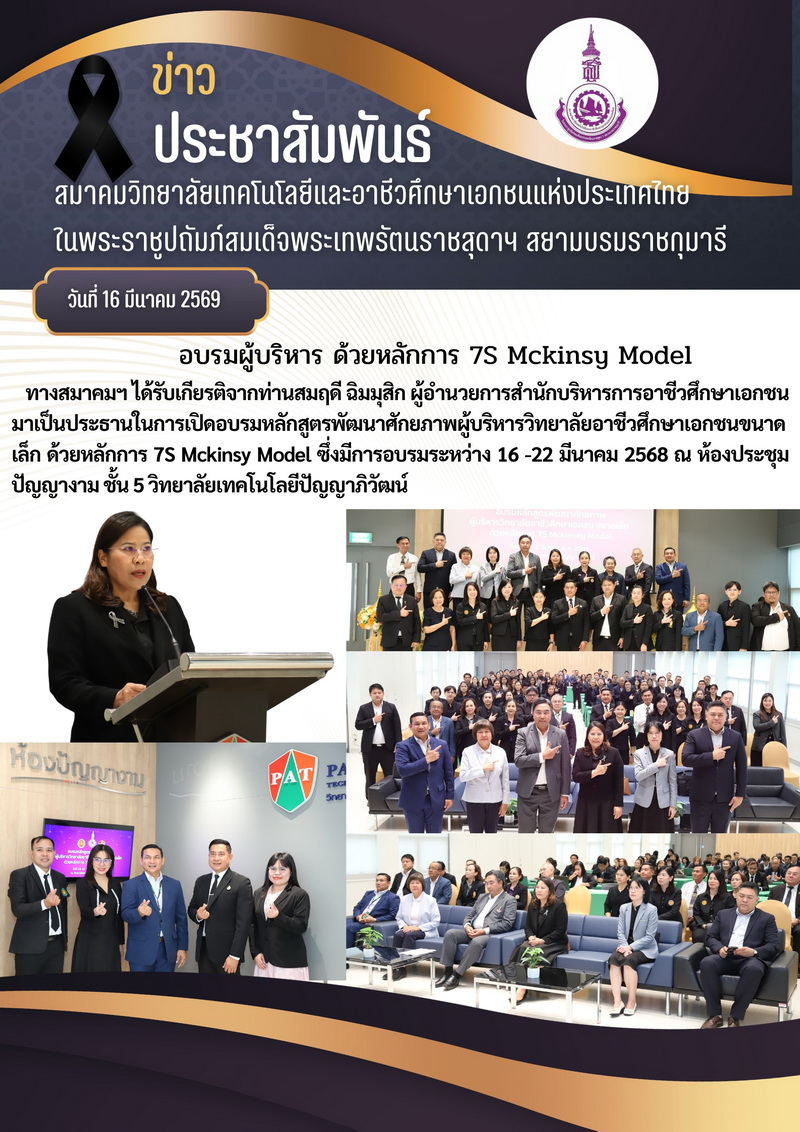 อบรมผู้บริหารวิทยาลัยขนาดเล็ก ด้วยหลักการ 7S Mckinsy Model วันที่ 16-22 มีนาคม 2569 ณ วิทยาลัยเทคโนโลยีปํญญาภิวัฒน์ จังหวัดนนทบุรี