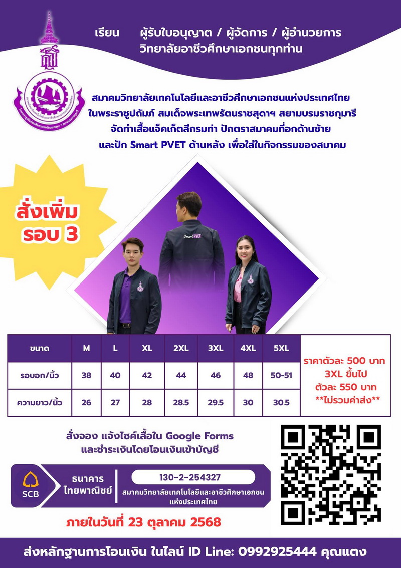 --- เรียน ผู้บริหารวิทยาลัยอาชีวศึกษาเอกชนทุกท่าน สมาคมฯจัดทำเสื้อแจ็คเก็ตสีกรมท่าปักตราสมาคมฯ เพื่อใส่ในกิจกรรมของสมาคมฯ (รอบที่ 3 ส่งภายในวันที่ 23 ตุลาคม 2568)